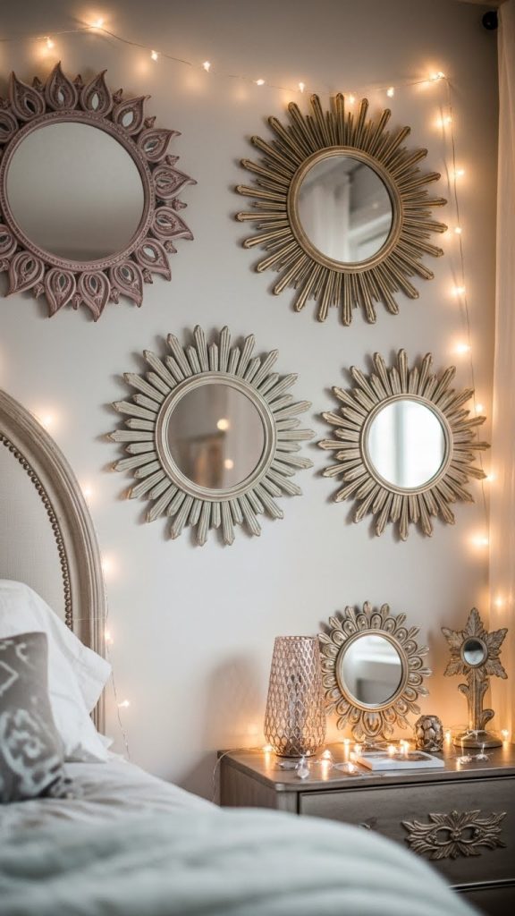 Mirrors not only make a room appear larger, but they can also enhance the magical, fairy-like atmosphere. Choose ornate frames in gold, silver, or pastel colors. Mirrors shaped like flowers, clouds, or sunbursts can become statement pieces that fit perfectly with your theme. Consider adding reflective surfaces, like metallic picture frames or shiny decor, to bounce light and create a twinkling effect throughout the room.