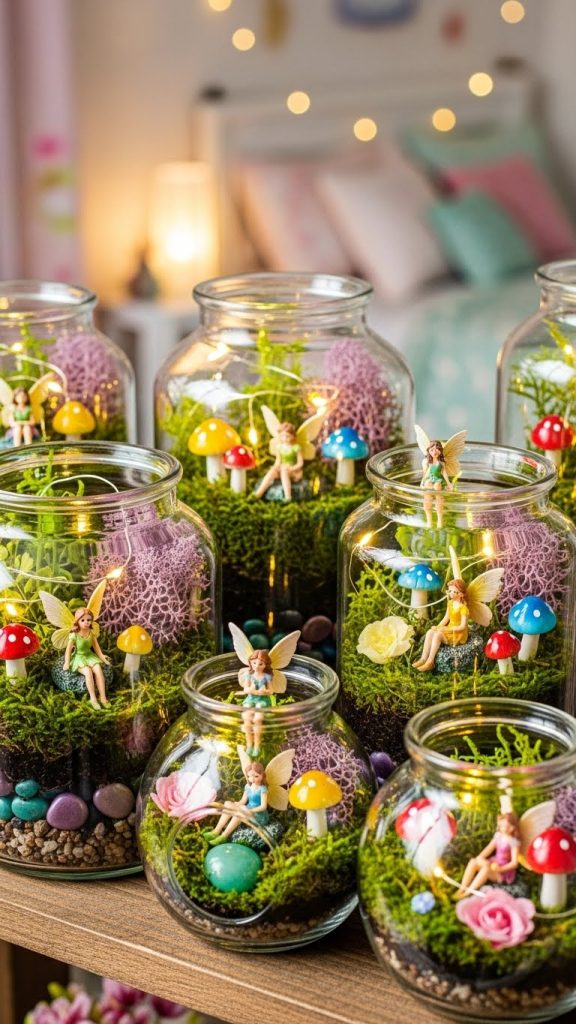 Terrariums are a simple yet captivating way to bring a touch of nature into a fairy bedroom. Miniature fairy gardens inside glass containers or jars can be customized with moss, small figurines, tiny mushrooms, crystals, or even battery-operated fairy lights. They add a magical, interactive element to your decor and can be placed on shelves, nightstands, or desks.