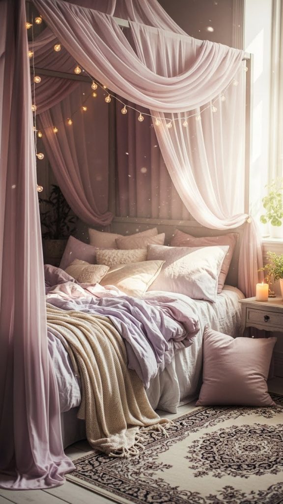 A canopy bed instantly evokes a fairy tale feel. Using sheer, flowing fabrics in soft hues like blush pink, lavender, or mint green can create an ethereal effect. You don’t need an actual canopy frame to achieve this look; a simple ceiling hook with draped tulle or chiffon fabric can transform any bed. For extra charm, consider adding tiny hanging crystals or string lights along the canopy.