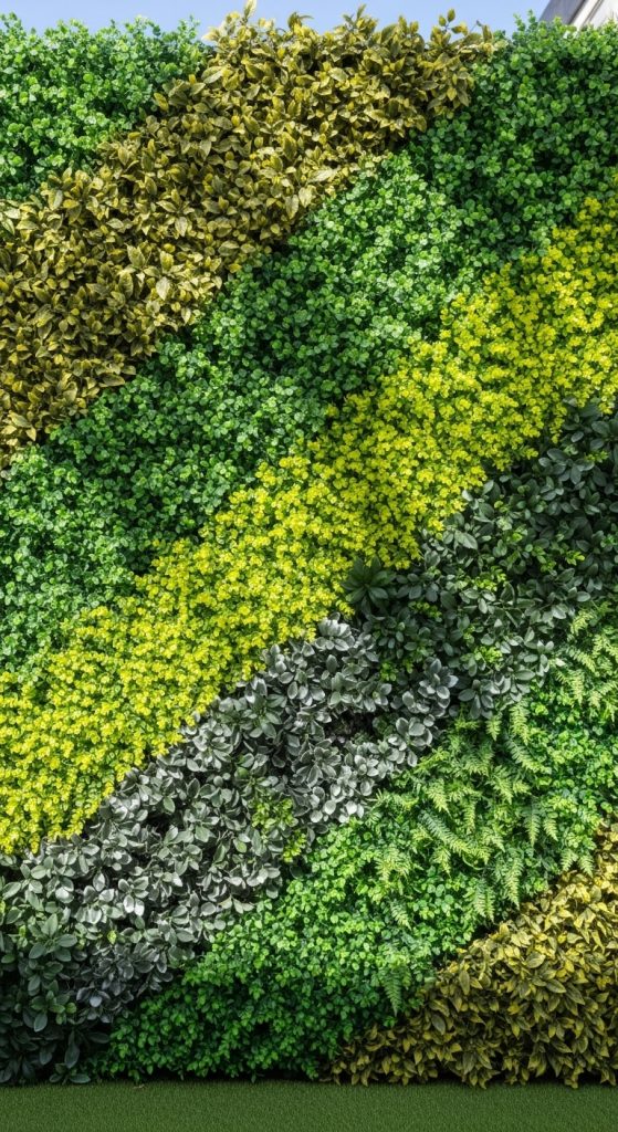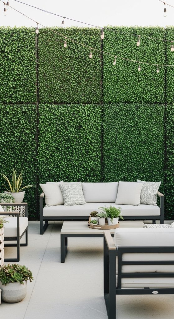 An artificial hedge wall creates a lush green backdrop that instantly adds privacy and style.