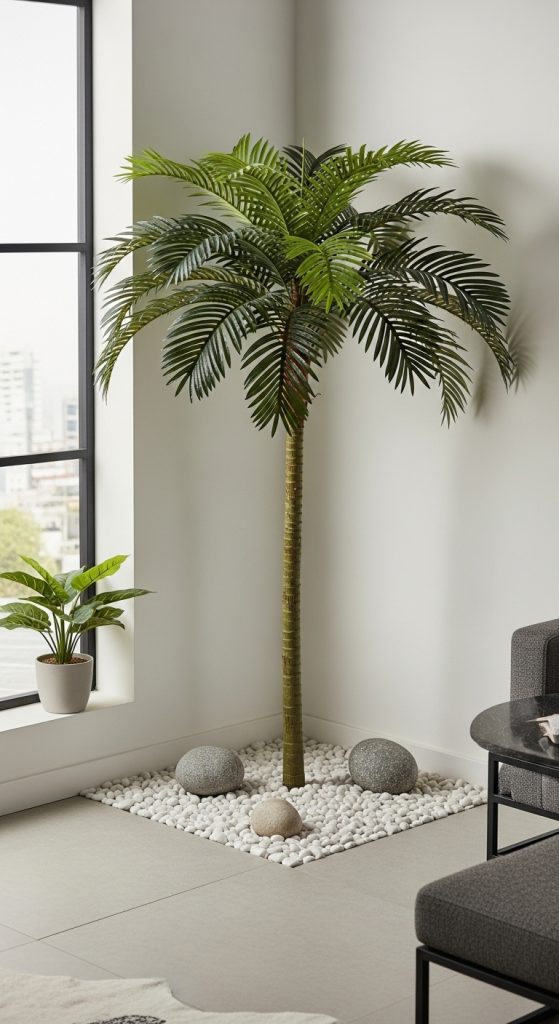 Place a large artificial palm in a corner with decorative elements.