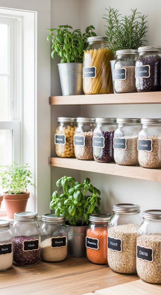 - Group jars by size and contents for visual harmony.