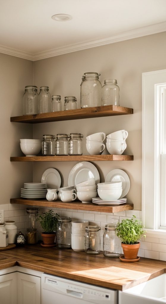 Open shelving not only adds farmhouse charm but also makes your kitchen feel larger and more inviting.