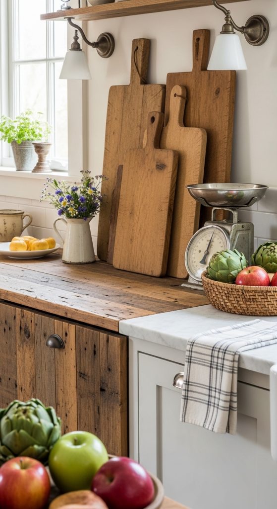 - Display a few rustic cutting boards standing vertically against the backsplash for a cozy, decorative touch.
