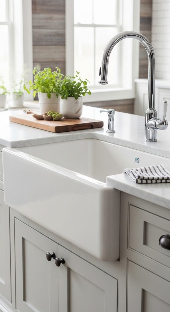 - Apron-front sink (stainless steel, porcelain, or fireclay)