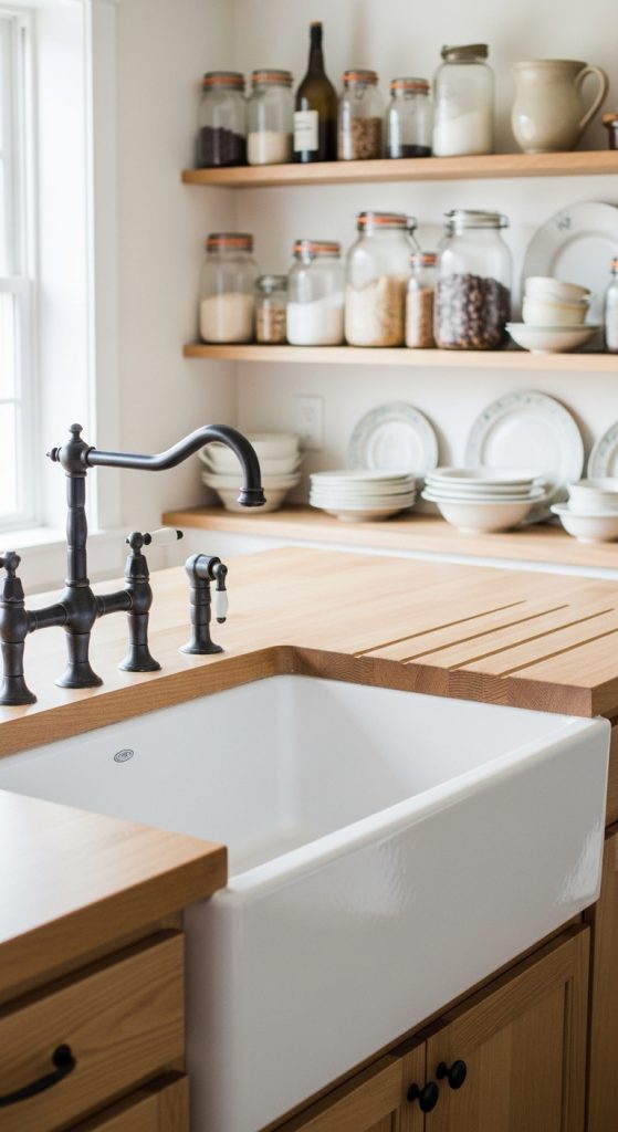 - Pair the sink with open shelves or wooden countertops for a cohesive farmhouse look.