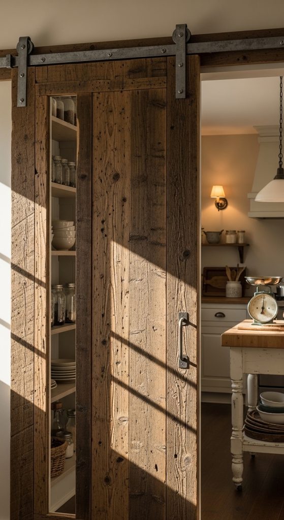Farmhouse kitchens often feature sliding barn doors, which add charm while saving space. Installing one for your pantry transforms a functional element into a stylish focal point.