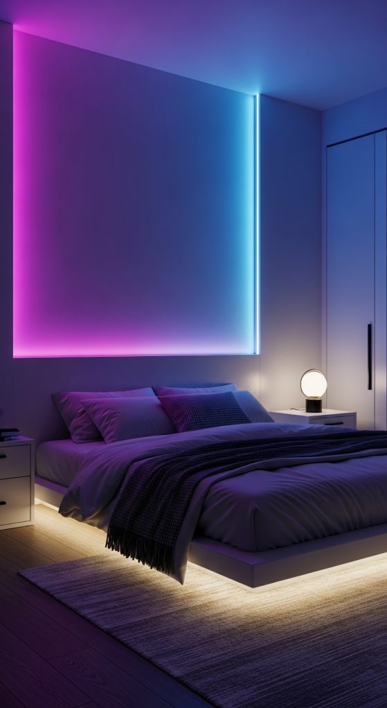 - Install LED strip lights behind bed.
