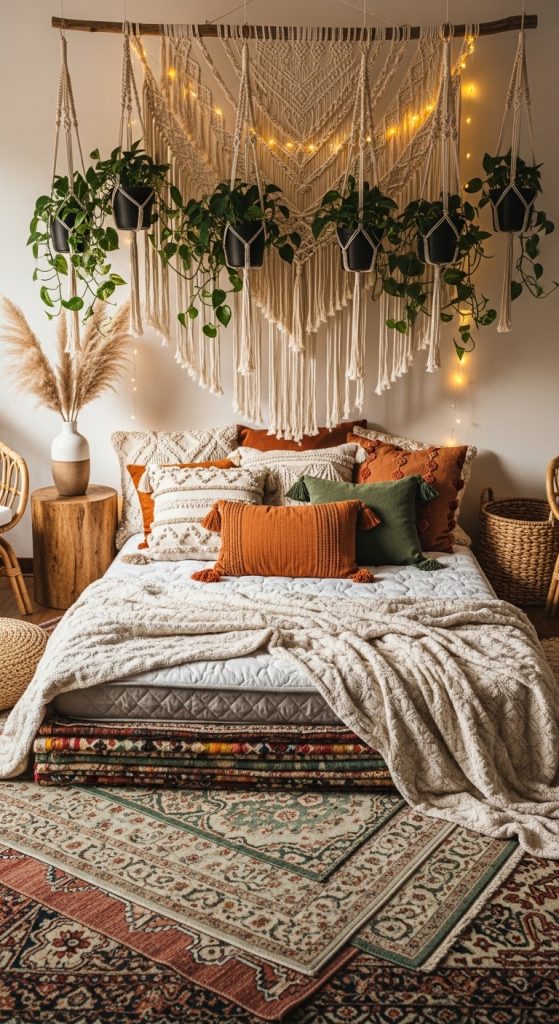 A boho-style floor bedroom features layered textures, plants, and warm lighting.