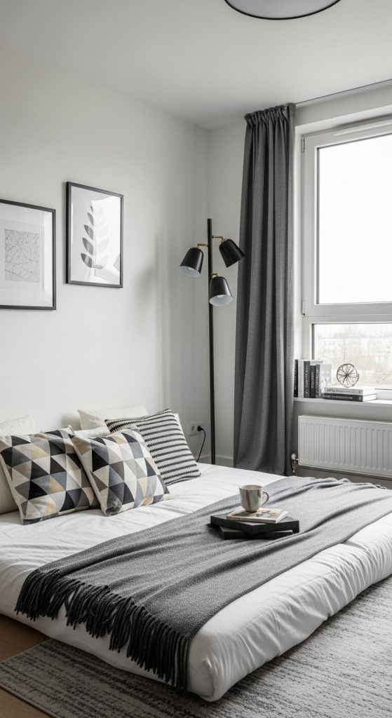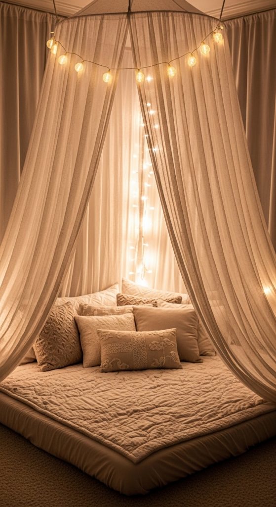 Lighting plays a major role in floor bedroom aesthetics. Soft lighting such as string lights, lanterns, or small bedside lamps can create a warm and relaxing atmosphere. Because floor beds are closer to the ground, lighting elements placed at low heights can make the room feel cozy and intimate.