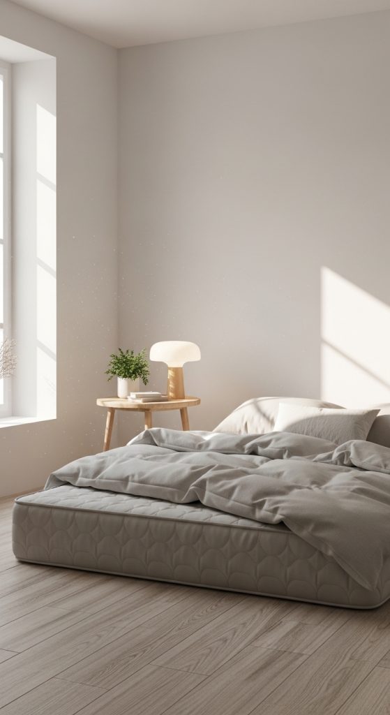 A minimalist floor mattress bedroom focuses on simplicity and clean design. The bed sits directly on the floor with neutral bedding and minimal decor.