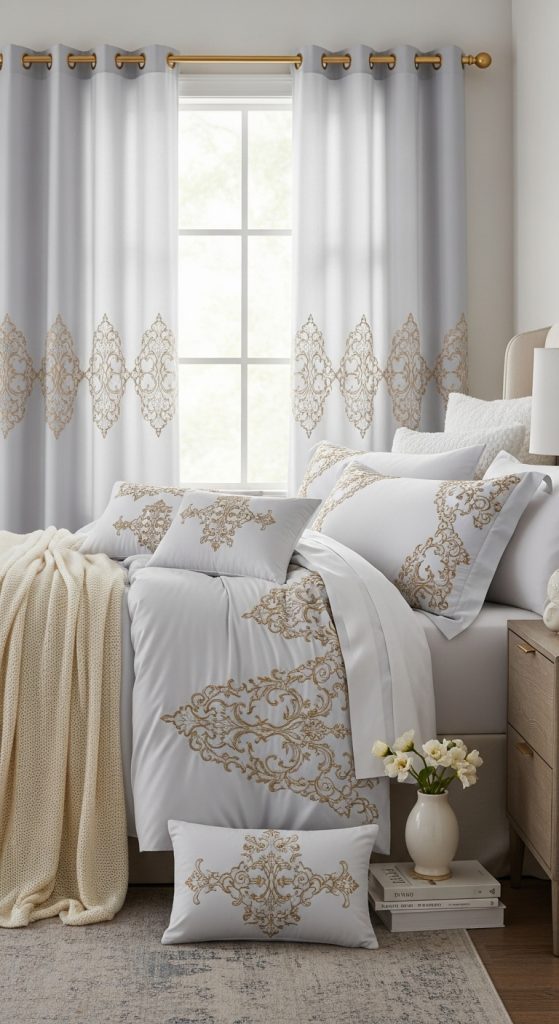 - Curtains: Curtains with subtle gold patterns or grommets can frame windows elegantly.