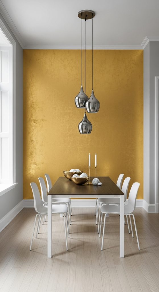 Gold accent walls work especially well in living rooms, bedrooms, and dining areas.