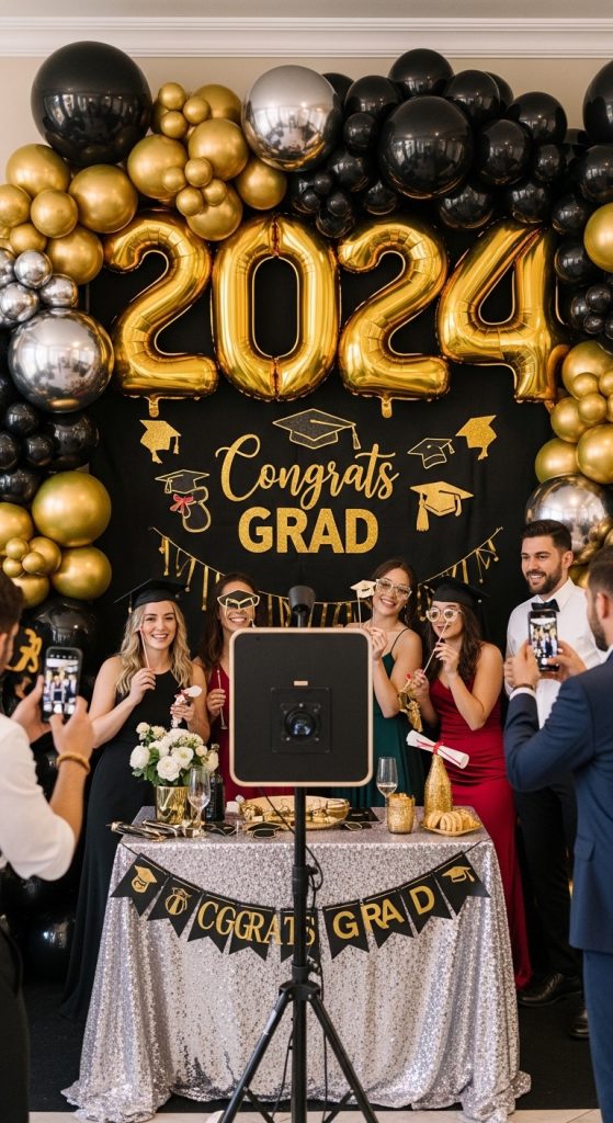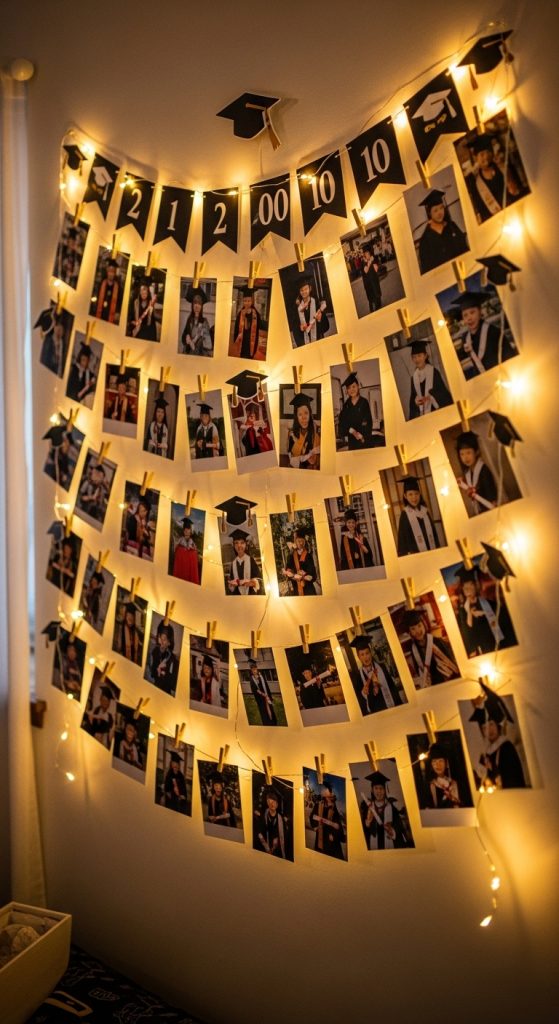 Photo displays are also a meaningful way to decorate a graduation party. Many hosts create memory walls, photo garlands, or display boards that show pictures from different stages of the graduate’s life. Guests enjoy seeing how the graduate has grown over the years, and these displays often become conversation starters during the event.