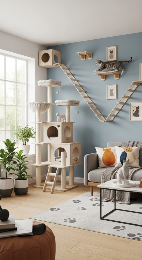 Finally, incorporate elements of style that reflect your cat’s personality while keeping your home aesthetically pleasing. Cat-themed décor, cozy blankets, or stylish cat furniture can blend seamlessly with your interior design. Modular cat furniture allows you to change layouts as your cat grows or their interests change.