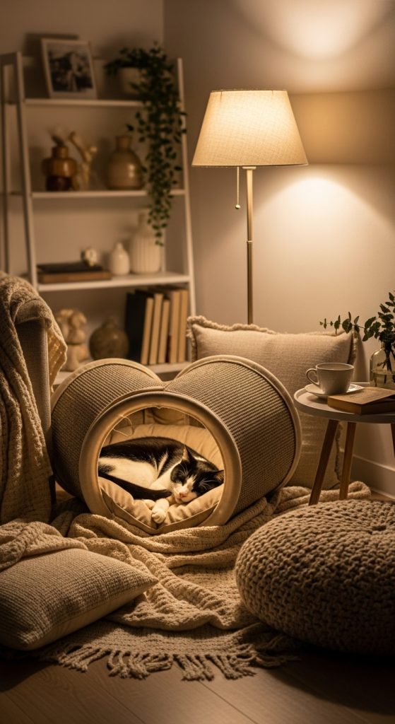 Cats often need time alone to decompress. Providing quiet retreats and hiding spots helps them feel safe and reduces stress. Consider using cat tunnels, enclosed beds, or even repurposed furniture like cabinets or storage benches with a cozy blanket inside.