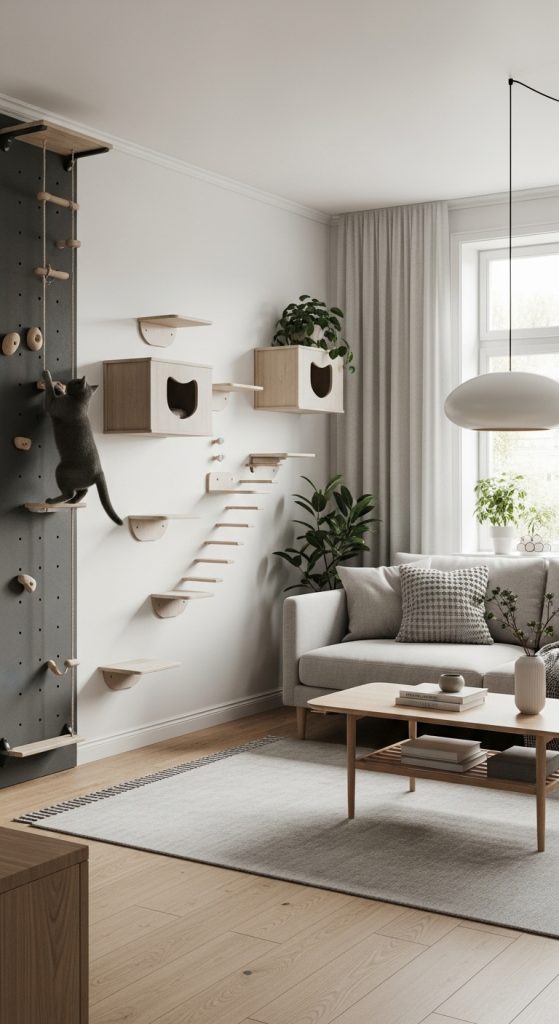 Cats are natural climbers. In the wild, they climb trees to hunt, escape predators, or find a comfortable perch. At home, giving your cat vertical space satisfies this instinct while also saving floor space. Consider installing cat shelves or wall-mounted perches. These can be staggered across a wall, forming a climbing path that keeps your cat entertained and physically active.