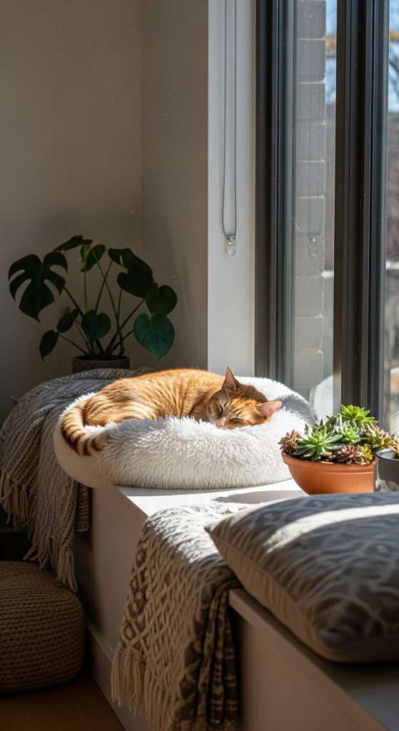 Consider placing napping areas near sunny windows, as cats adore basking in sunlight. Window perches or hammocks can combine a warm sun spot with an elevated viewpoint, allowing your cat to watch the world outside. You can also rotate their favorite beds and blankets to keep their environment stimulating and comfortable.
