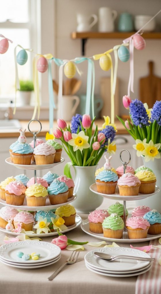 - Tiered trays with pastel cupcakes.