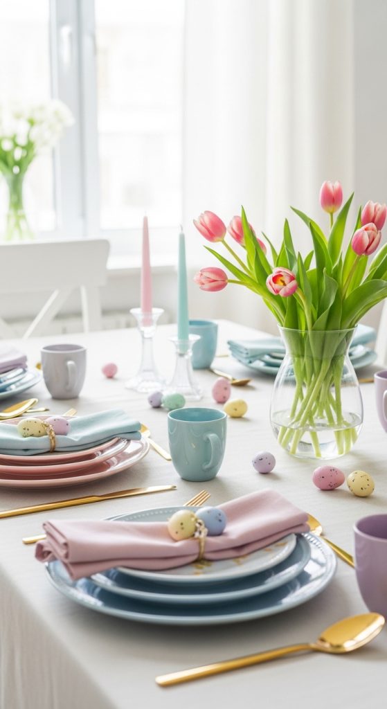 Pastels instantly evoke spring and create a soft, welcoming atmosphere perfect for Easter brunch.