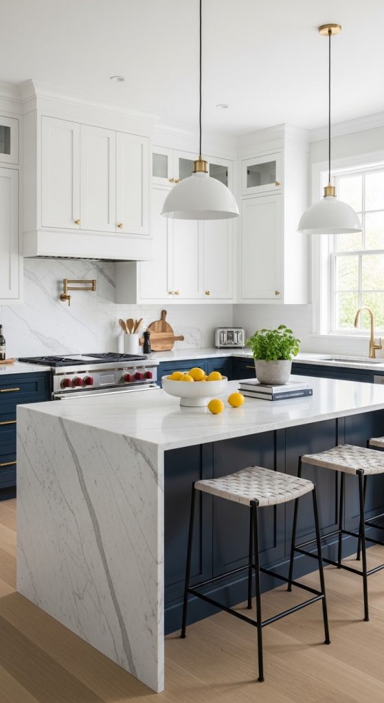 Two-tone cabinetry is trending across Pinterest. Combining two colors — like white uppers and navy lowers — creates depth and contrast.