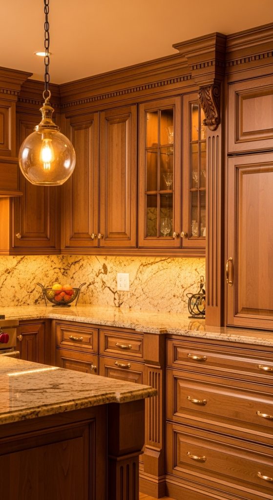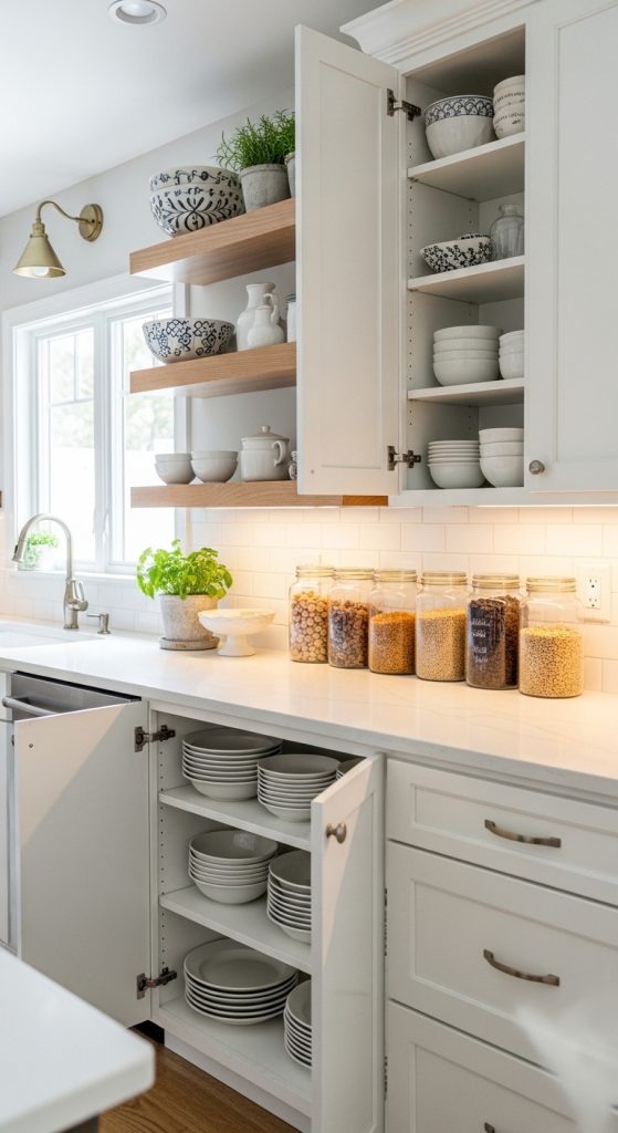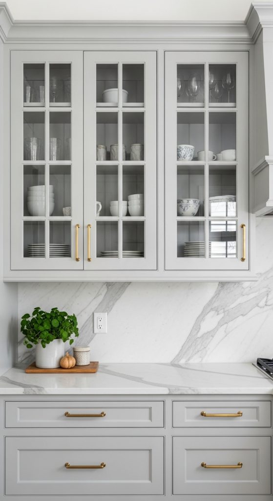Glass-front cabinets instantly make a kitchen feel more open and elegant. They’re ideal for displaying dishware, glassware, or decorative pieces. This design works well in transitional, farmhouse, and even modern kitchens.