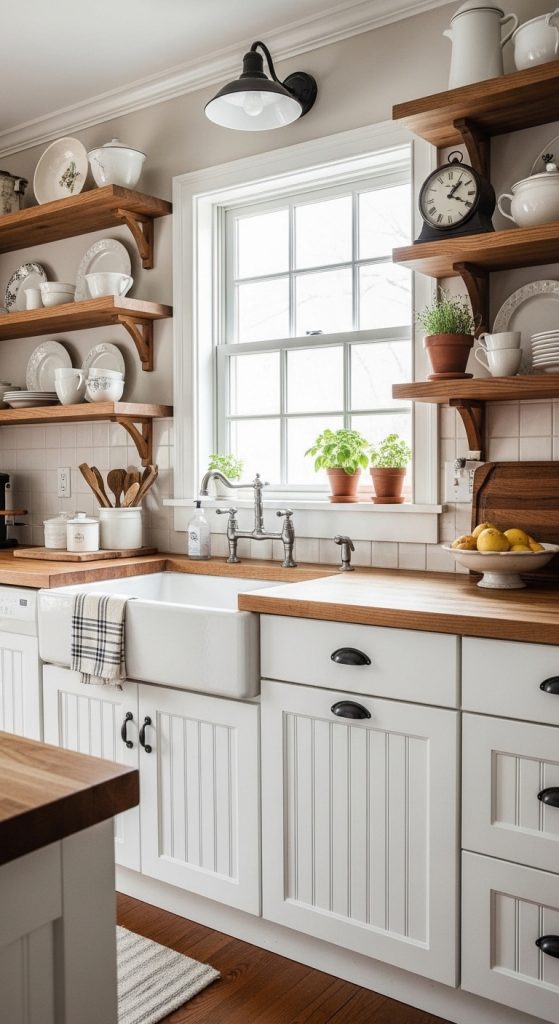 Beadboard cabinet doors add cozy farmhouse texture. The vertical grooves create visual interest without overwhelming the space.