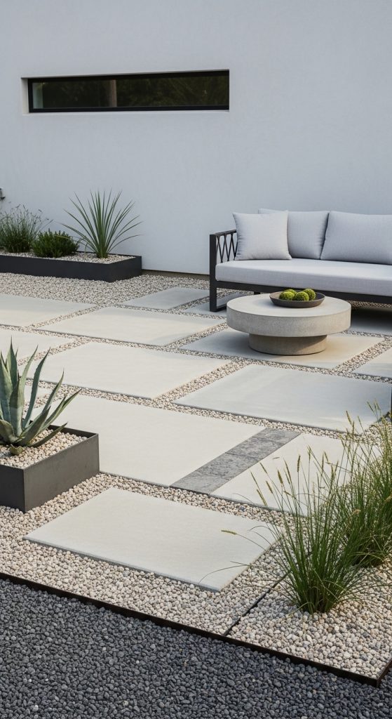 Gravel and stone landscaping is perfect for a clean, modern, and low-maintenance patio surround. This idea works especially well in dry climates or for homeowners who prefer minimal upkeep. It adds texture and contrast while keeping the space neat and organized.