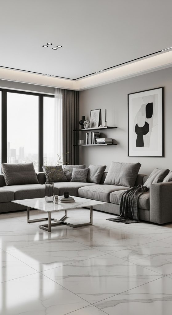 Gray and marble white create a sleek modern luxury aesthetic.