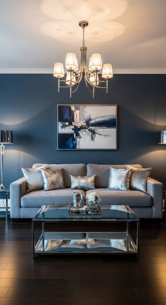 Navy blue combined with silver creates a refined and elegant interior design style.