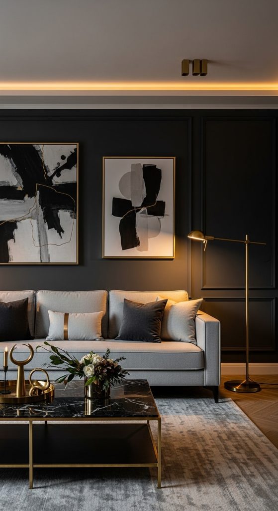 Charcoal gray combined with brass accents creates a modern and dramatic luxury look.