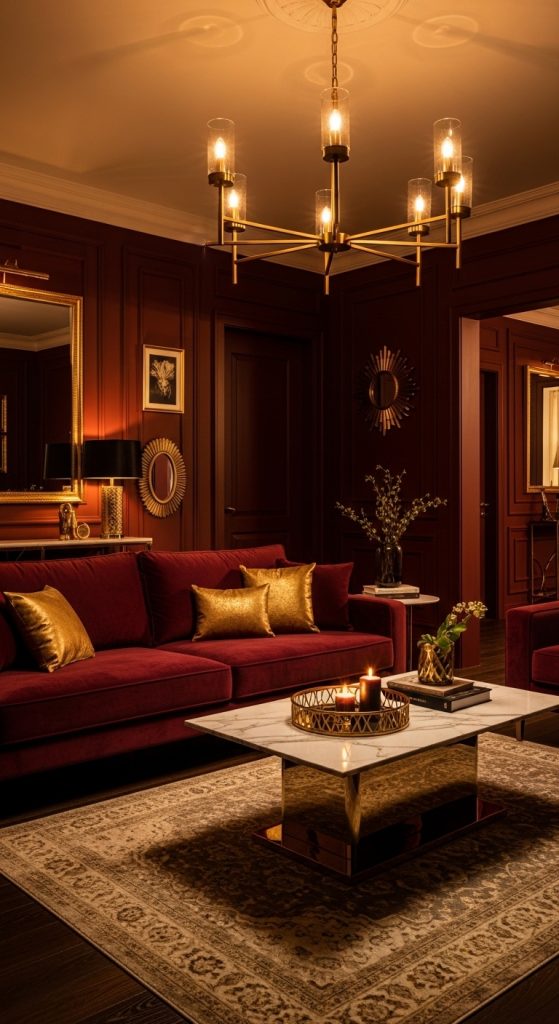 Burgundy and gold create a rich and luxurious atmosphere.