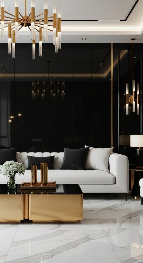 The contrast between black and white adds sophistication, while gold accents introduce warmth.