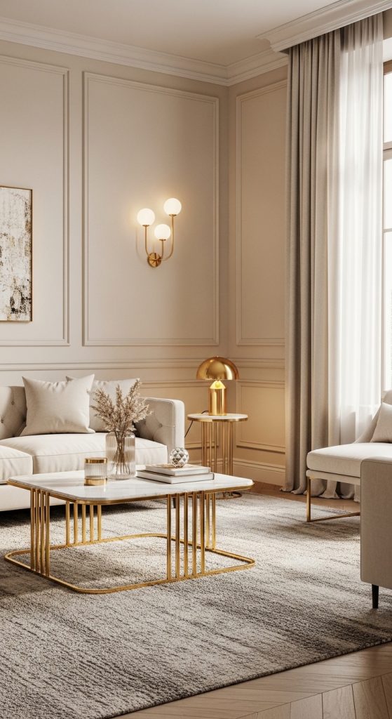 Beige and cream provide a calming base while gold accents add warmth and glamour.