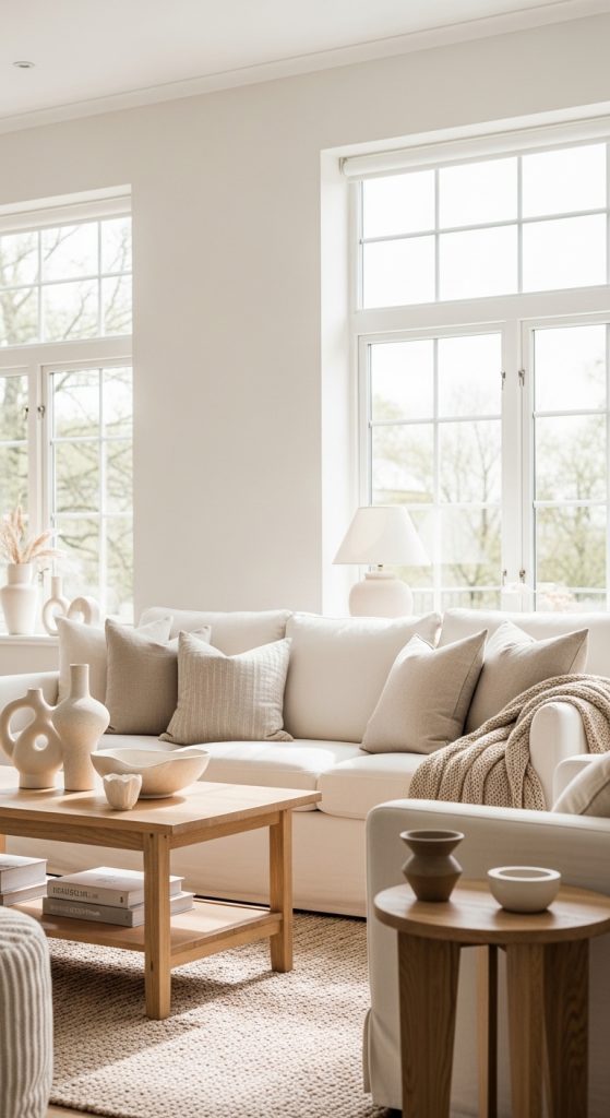 Ivory combined with natural wood tones creates a warm and timeless luxury design.