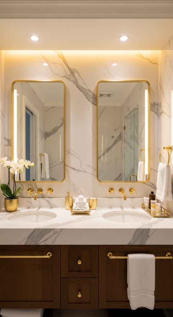Use marble, gold accents, and large mirrors to create a sophisticated and relaxing environment.
