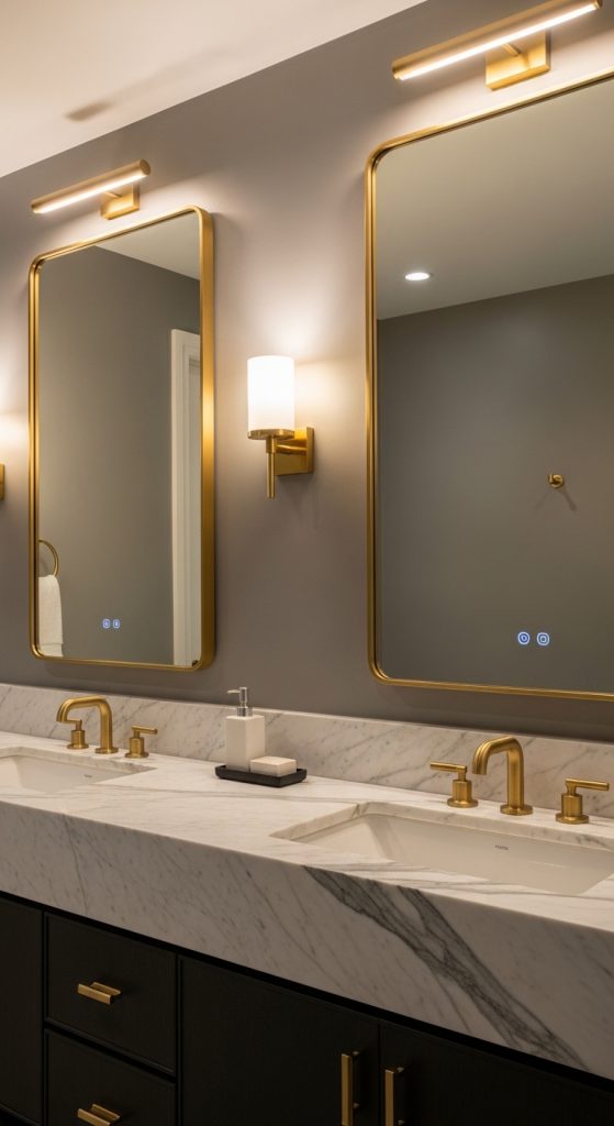 Lighting should be layered. Combine overhead lighting with mirror lighting to ensure both functionality and ambiance. Avoid harsh lighting that creates shadows.