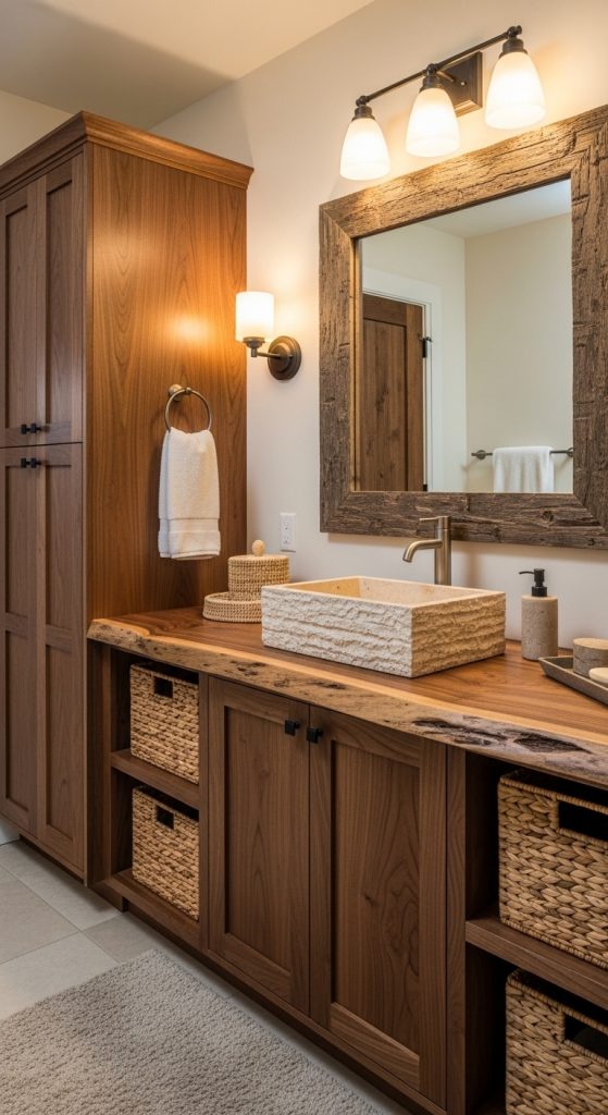 A wooden vanity adds warmth and natural beauty to the bathroom. It works well in rustic or organic-inspired designs.