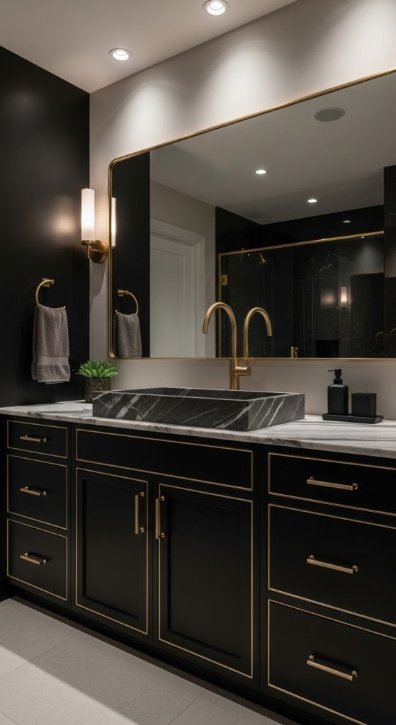 A black vanity creates a bold and sophisticated statement. Matte finishes add elegance without being too reflective.