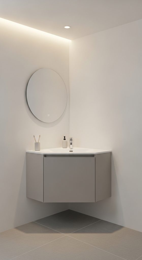 A corner vanity is perfect for maximizing small bathroom spaces. It fits neatly into unused corners without disrupting movement.