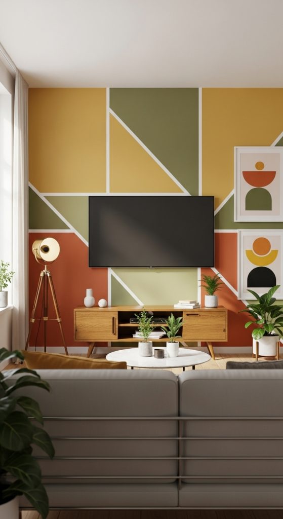 Mid-century modern design often incorporates geometric shapes in art, furniture, and wall treatments. Creating a TV wall with geometric patterns, whether through wallpaper, wall panels, or paint, adds visual interest while maintaining clean lines.
