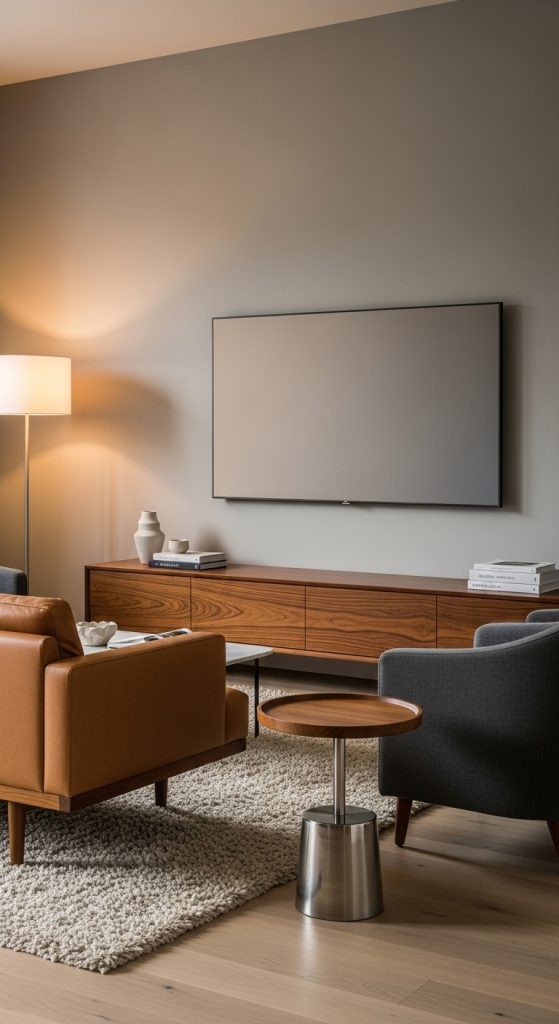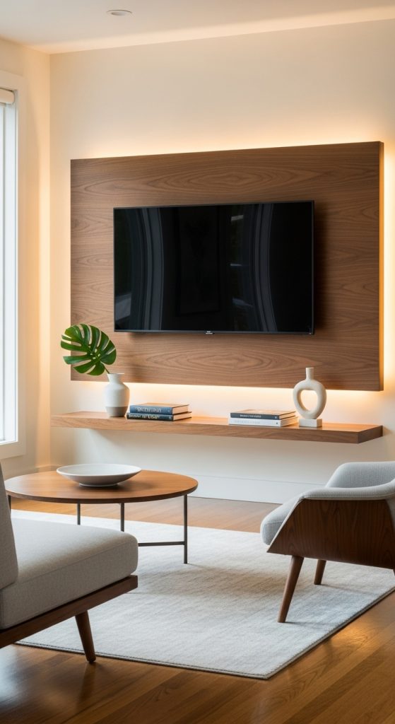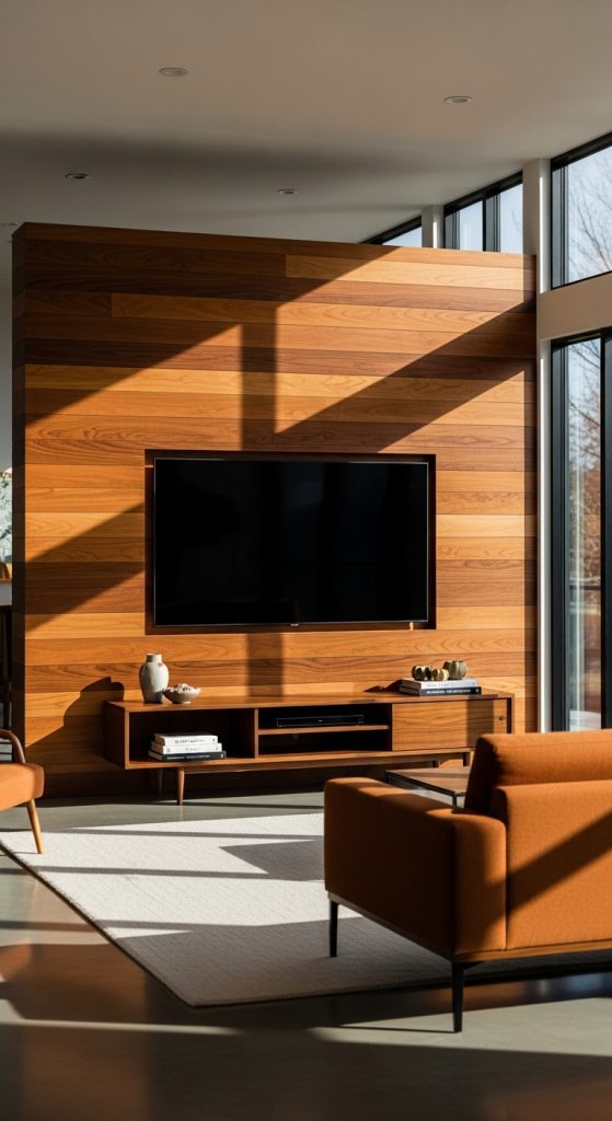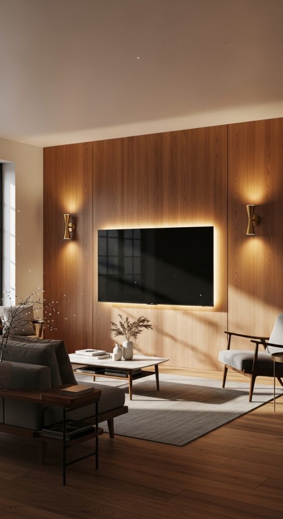 Wood panels are a hallmark of mid-century design, bringing warmth and texture to any space. A TV mounted on a rich, natural wood panel instantly becomes the focal point of the living room. You can use vertical or horizontal panels depending on the room’s proportions. Horizontal panels, for instance, elongate the room and make it feel more spacious.