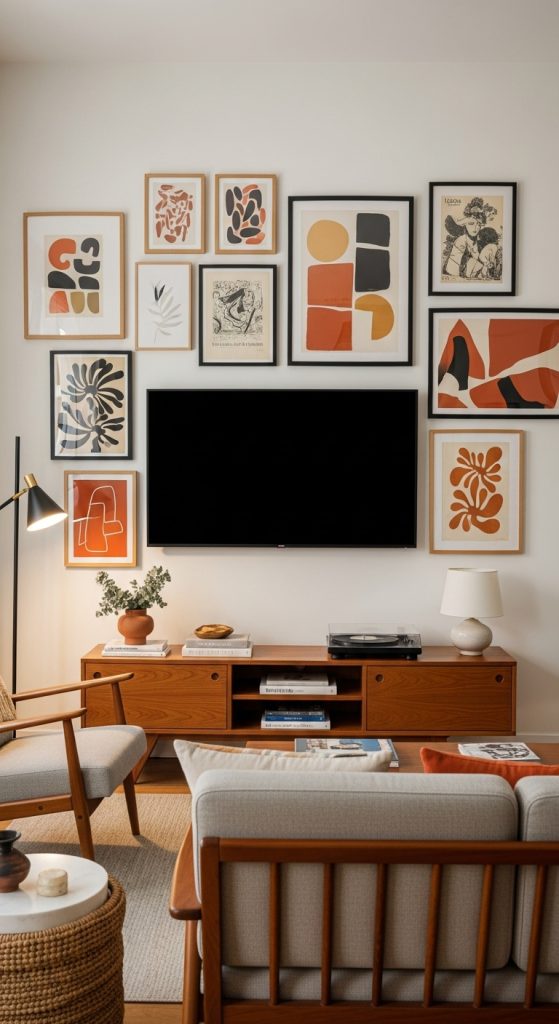 Turning your TV wall into a gallery is a creative way to combine entertainment with art. Surround your TV with framed mid-century modern artwork, abstract prints, or vintage photos. Ensure that the frames and artwork align with the clean lines and muted tones characteristic of the style.