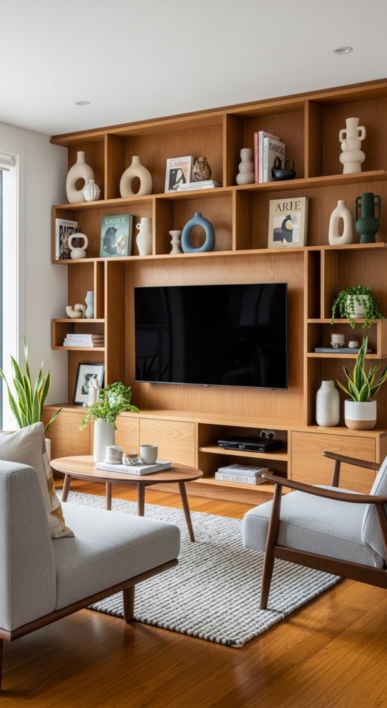 Functionality is key in mid-century modern design. Incorporating built-in shelving around your TV allows you to display books, decorative objects, and plants while maintaining a streamlined look. Choose shelves with clean, geometric shapes and opt for materials like wood or metal to keep the design cohesive.
