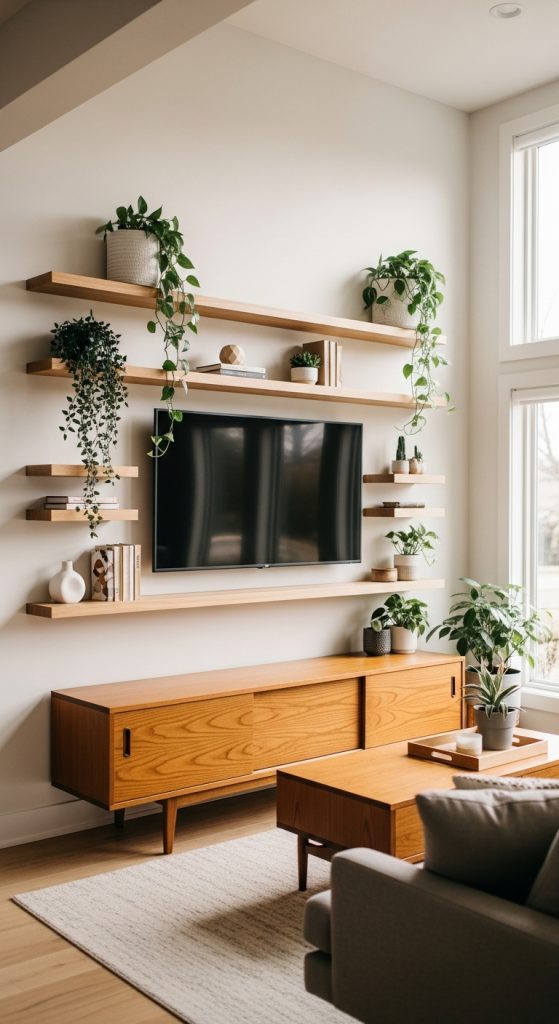 Pair wooden floating shelves with a sleek TV mount to maintain clean lines. The combination of nature and structured design embodies the essence of mid-century modern style.