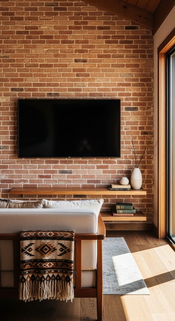 Keep the TV centered and use minimal décor around it. The stone or brick itself becomes a design statement, making the wall both functional and visually appealing. Pair with a simple floating shelf or console for a balanced look.