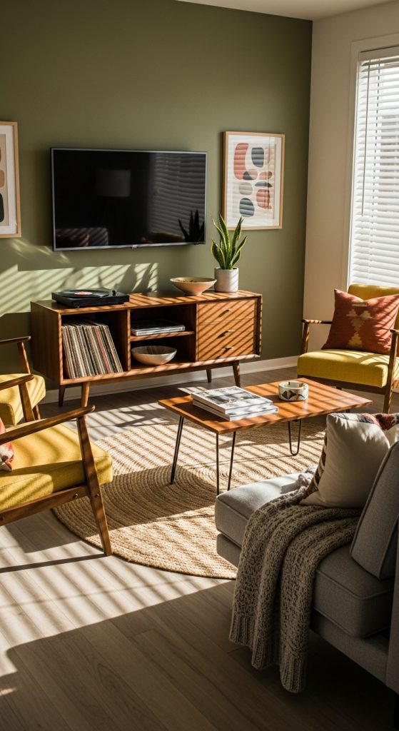 This approach not only adds storage but also frames your TV as part of the overall design. Mixing open and closed shelving can prevent the wall from looking too busy while maintaining mid-century simplicity.