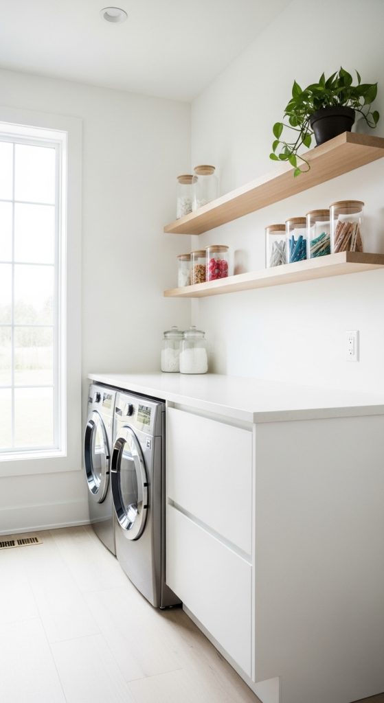 The washer and dryer can be placed in a recessed wall area or enclosed cabinet. Above them, install floating shelves or cabinets for storage. A sliding door or curtain can hide the laundry setup when not in use.