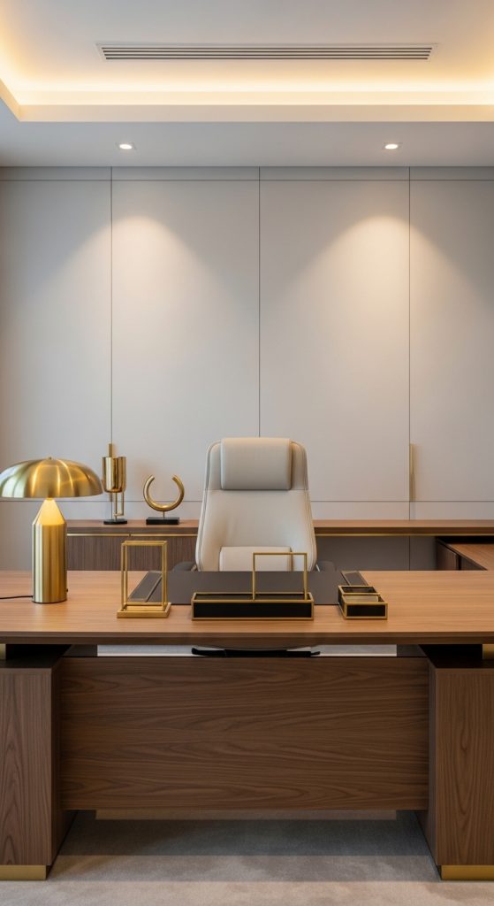 This style combines minimalism with luxury. A large clean desk, premium materials like wood and metal, and subtle gold accents define this setup.