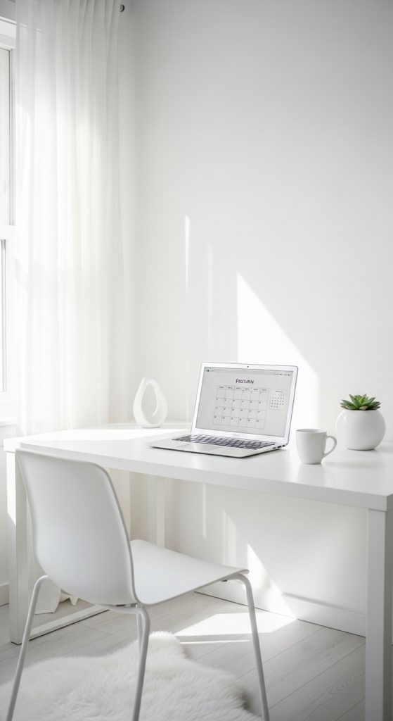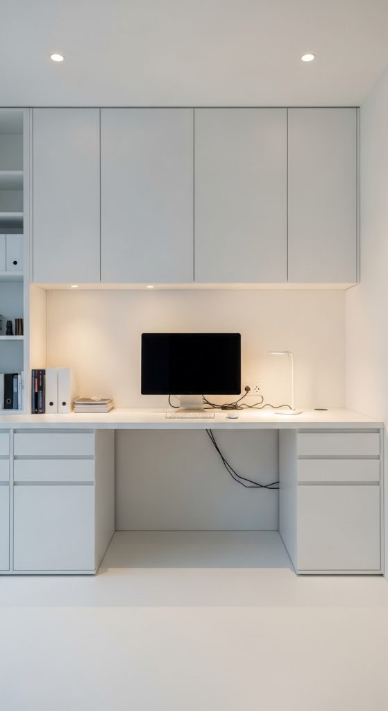 An all-white office is one of the purest forms of minimalism. White walls, white desk, and white accessories create a bright and distraction-free environment. This setup enhances focus and gives a sense of clarity.